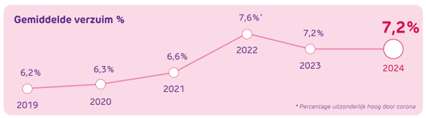 Het verzuimpercentage in het primair onderwijs blijft met 7,2% in 2024 aanzienlijk hoger dan de jaren voor de coronapandemie. Sinds 2019 is er een stijgende trend zichtbaar, met een piek van 7,6% in 2022. Hoewel er in 2023 en 2024 een lichte verbetering te zien is ten opzichte van 2022, blijft het verzuim bijna een procentpunt hoger dan in 2019, het jaar voor de pandemie.