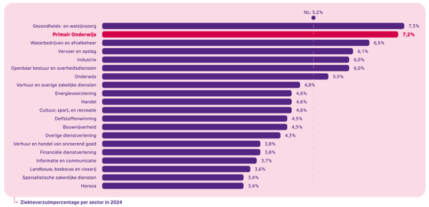 - Het verzuimpercentage in het primair onderwijs (7,2%) ligt aanzienlijk hogerdan het landelijk gemiddelde van alle sectoren in Nederland (5,2%) en ook hoger dan het gemiddelde van de gehele onderwijssector (5,5%). Dit maakt het primair onderwijs een van de sectoren met het hoogste verzuimpercentage in Nederland, wat zorgwekkend is. Het verzuimpercentage is zelfs twee keer zo hoog als in de sectoren met het laagste verzuim, zoals de horeca en specialistische zakelijke diensten (3,4%).