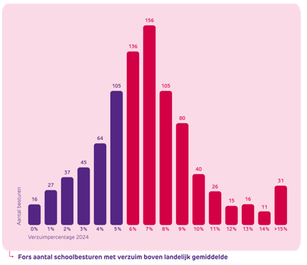 - Fors aantal schoolbesturen heeft een verzuimpercentage boven het landelijk gemiddelde. Zo is bij ruim 70% van de schoolbesturen het verzuim hoger dan het landelijk gemiddelde (5,2%) en heeft 25% van de schoolbesturen zelfs een verzuimpercentage hoger dan 8,5%. Dit toont aan dat de verzuimproblematiek niet gelijkmatig over de sector is verdeeld. Het grootste aandeel in het verzuim komt van schoolbesturen met bovengemiddelde verzuimpercentages.