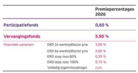 De premiepercentages voor het Vervangingsfonds stijgen. Het percentage voor reguliere aansluiting gaat van 4,30% in 2025 naar 5,90% in 2026. Ook de percentages voor de ERD-varianten stijgen.